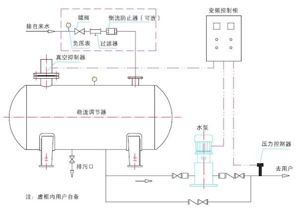 KBW罐式无负压(管网叠压)供水设备即实用环保节能型高楼自动供水装置,是为了克服原有变频供水设备的缺点,采用封闭式智能型的耐压不锈钢罐(稳流罐)作供水体,稳流罐设有进水口与市政协委管网连接(同时可选装过滤、消毒装置),罐体下部出水口与水泵机组连接。稳流罐配备有压力传感和真空抑制器等装置,整套机组在变频控制柜的控制下实现恒压的自动供水,利用了市政管网的原始压力,对市政管网不产生吸程,而且卫生无二次污染。