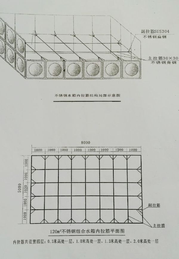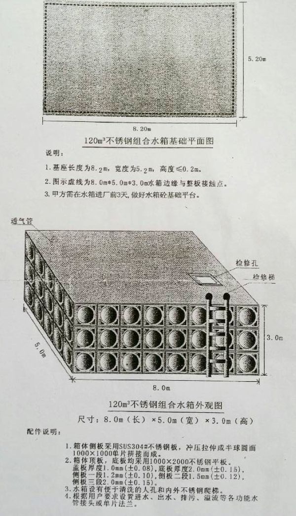 不锈钢组合水箱:容积600m3 规格尺寸20mx10x3m 2010年安装于云梦中一科技有限公司,水箱底板2.0mm,侧板一二三段分别为2.5-2.0-1.5,顶板1.0mm,水箱拉筋角40x40x2.5mm。